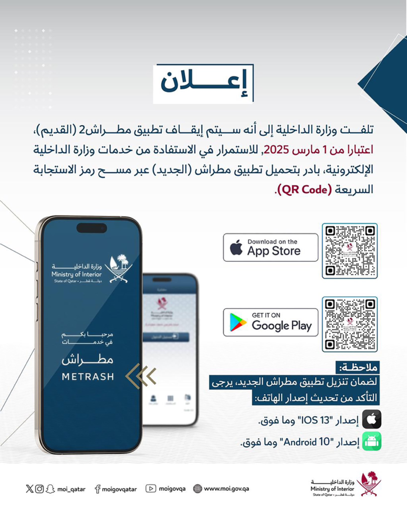 قبل إيقاف النسخة القديمة، يمكن للمستخدمين تحميل تطبيق “مطراش” الجديد عبر البحث عنه في متجري “App Store” و”Google Play”، أو عبر زيارة الموقع الرسمي لوزارة الداخلية القطرية.