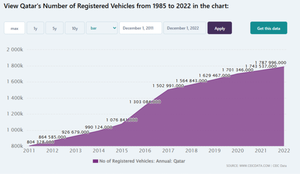تشير البيانات الصادرة عن موقع البيانات الاقتصادية الكلية العالمي إلى أن عدد المركبات المسجلة في قطر بلغ في ديسمبر 2022 نحو مليون و788 ألف مركبة، وهو أعلى رقم تم تسجيله منذ بدء التوثيق قبل ما يقارب أربعة عقود، وهو ما يعكس ارتفاعاً ملحوظاً مقارنة بعام 2021 الذي بلغ فيه عدد المركبات نحو مليون و744 ألف مركبة، مما يدل على التوسع المطرد في تسجيل السيارات وازدياد الاعتماد عليها في الحياة اليومية والاقتصاد الوطني.